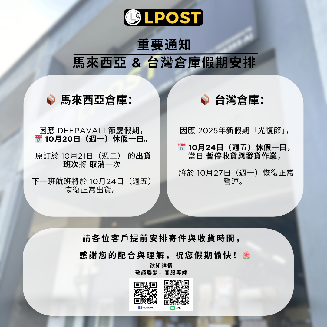 【重要通知|馬來西亞 & 台灣倉庫假期安排】deepavali&光復節