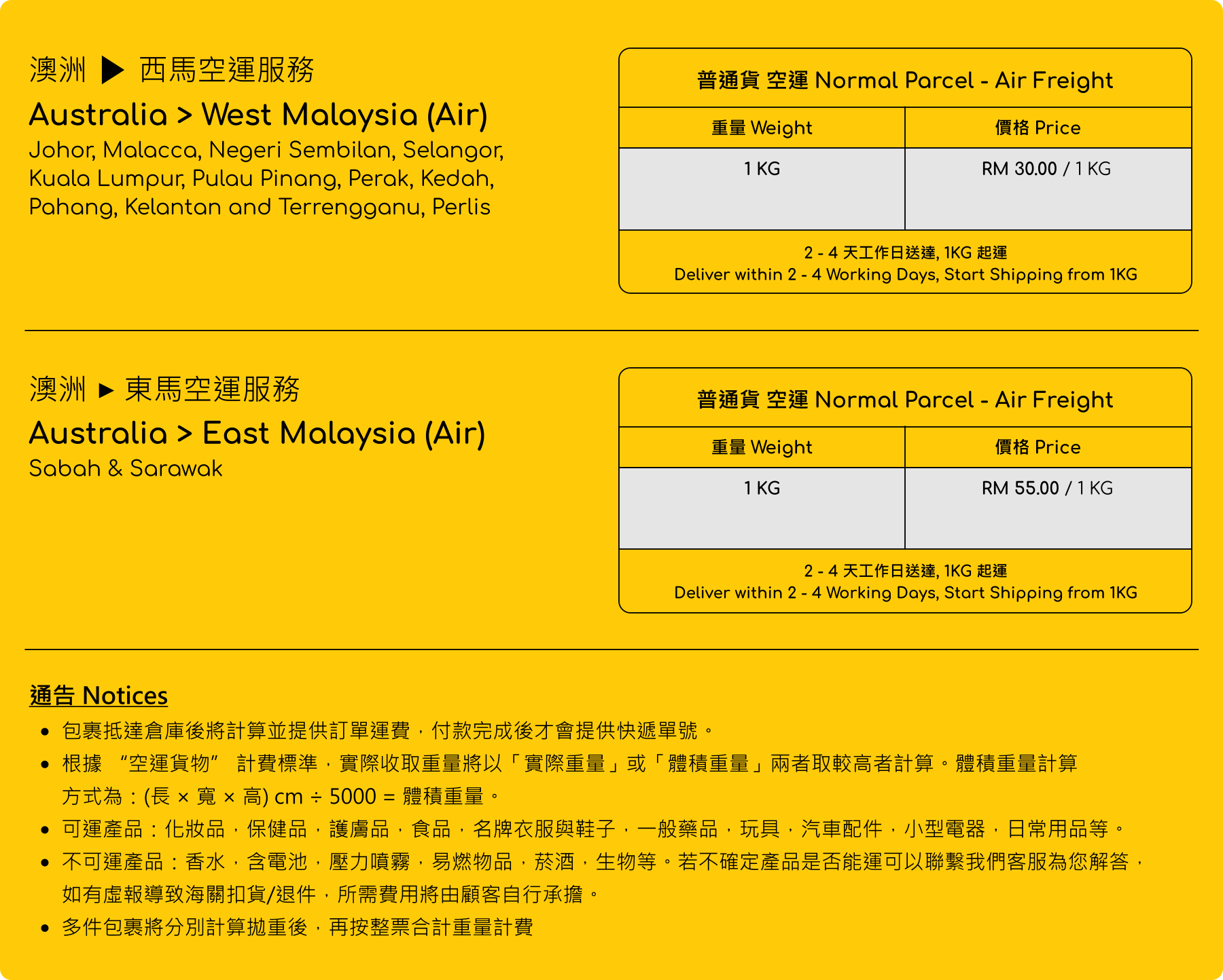 澳洲 ▶ 馬來西亞 (空運)