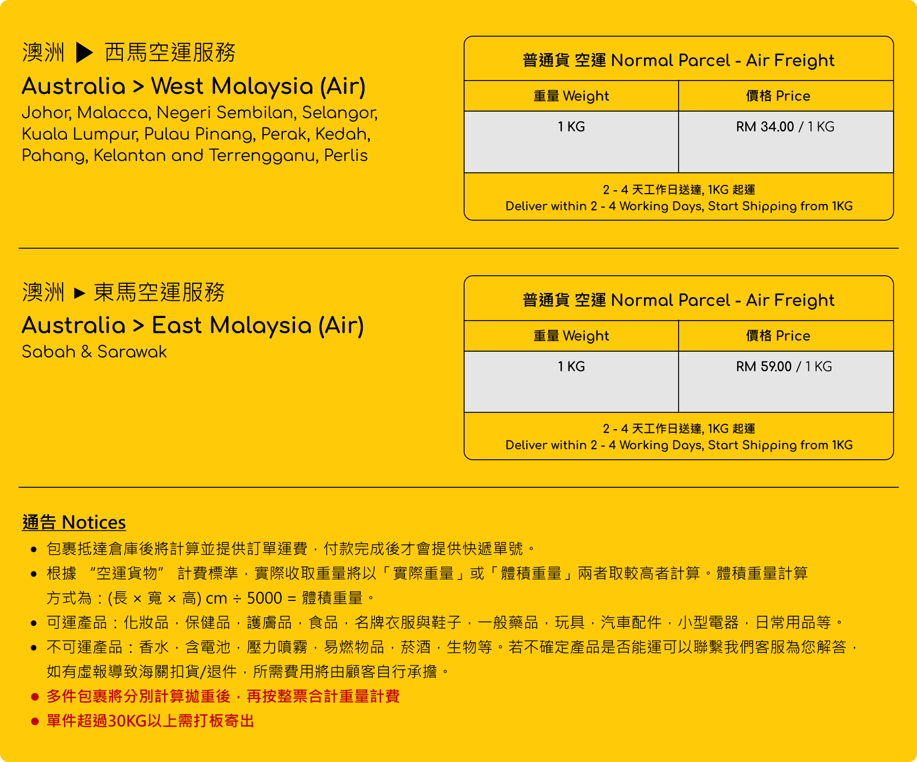 澳洲 ▶ 馬來西亞 (空運)